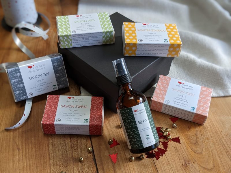 Ce coffret comprend une huile de massage Relax ainsi que 5 savons (1 zen, 1 Toudou, 1 Swing, 1 Pep’s, 1 Twist) dans une boîte en carton réutilisable.